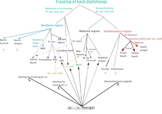 また、どのような基準で分類されているのかが不明な、North Central, North proper, Florida, Charleston には「?」マークを付けておいた。本をじっくり読んでも理解できなければ、機会を見つけてLabov氏に直接尋ねてみるつもりだ。
